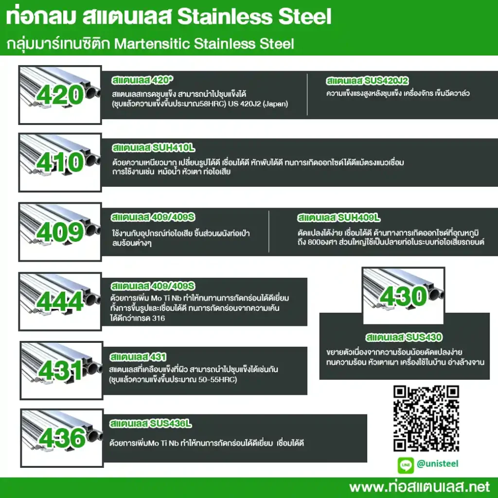 - สแตนเลส SUS304CU : เพิ่มธาตุ CU ทำให้ขึ้นรูปได้ดียิ่งขึ้น โดยเฉพาะการขึ้นรูปลึกเครื่องใช้ในบ้าน อ่างห้องครัว และ อ่างอาบน้ำเป็นต้น