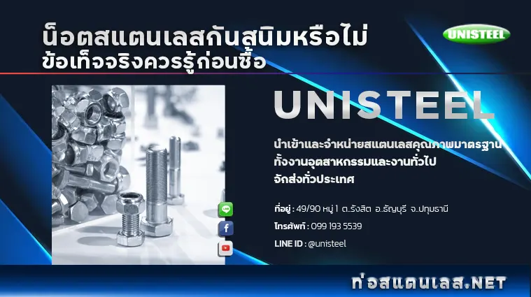 น็อตสแตนเลสเป็นวัสดุที่มีคุณสมบัติที่ดีในเรื่องของความทนทานต่อการสึกหรอ ความทนทานต่อสภาวะอุณหภูมิ และความทนทานต่อสารเคมี อย่างไรก็ตาม การเลือกซื้อและการดูแลรักษาต้องทำอย่างรอบคอบ เพื่อให้น็อตสแตนเลสสามารถให้ประสิทธิภาพการทำงานที่ดีในระยะยาวได้ และหลีกเลี่ยงการเกิดปัญหาที่ไม่คาดคิดในการใช้งานในอุตสาหกรรมและงานอื่นๆ อีกทั้งยังช่วยสร้างความมั่นใจให้กับผู้ใช้งานในการใช้งานสินค้าได้อย่างมั่นใจและปลอดภัยอีกด้วย ปรึกษาฟรี LINE ID : @unisteel